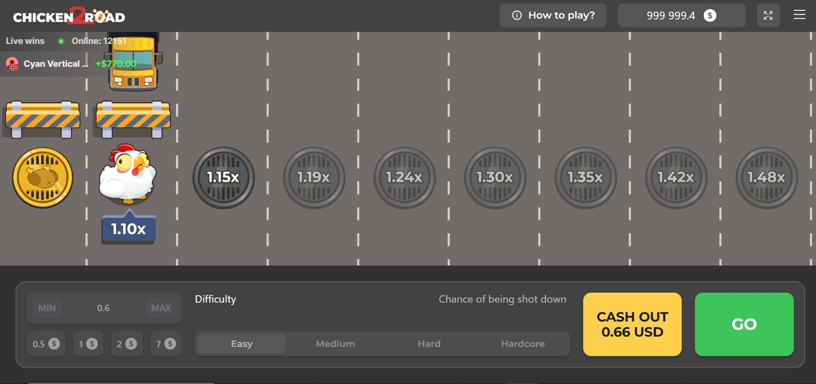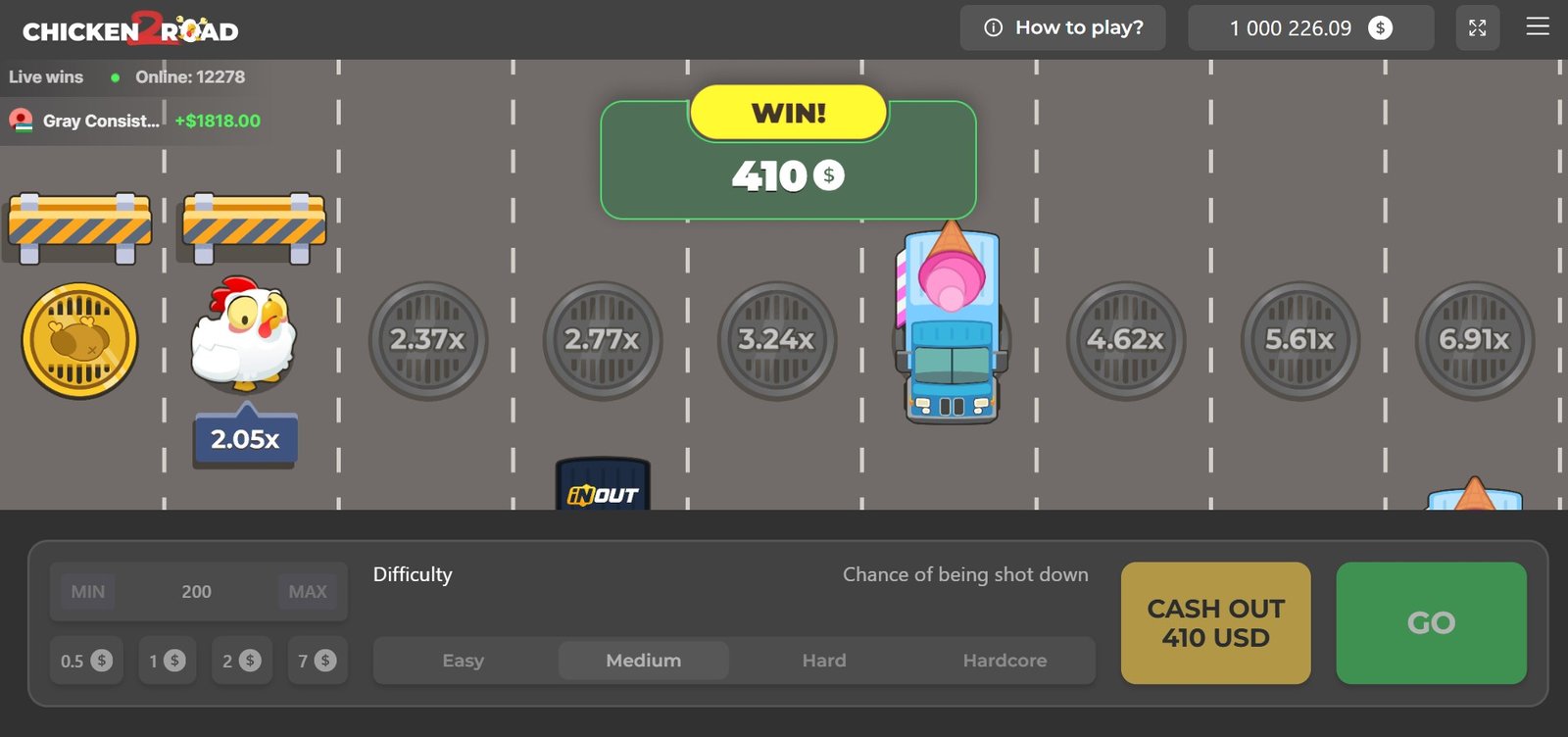 Il tuo obiettivo è incassare prima che la gallina si faccia investire. Non appena il moltiplicatore ti sembra soddisfacente, clicca per ritirare la vincita: la tua puntata viene moltiplicata per il valore visualizzato sullo schermo. Se aspetti troppo, perdi l’intero importo puntato in quel round.